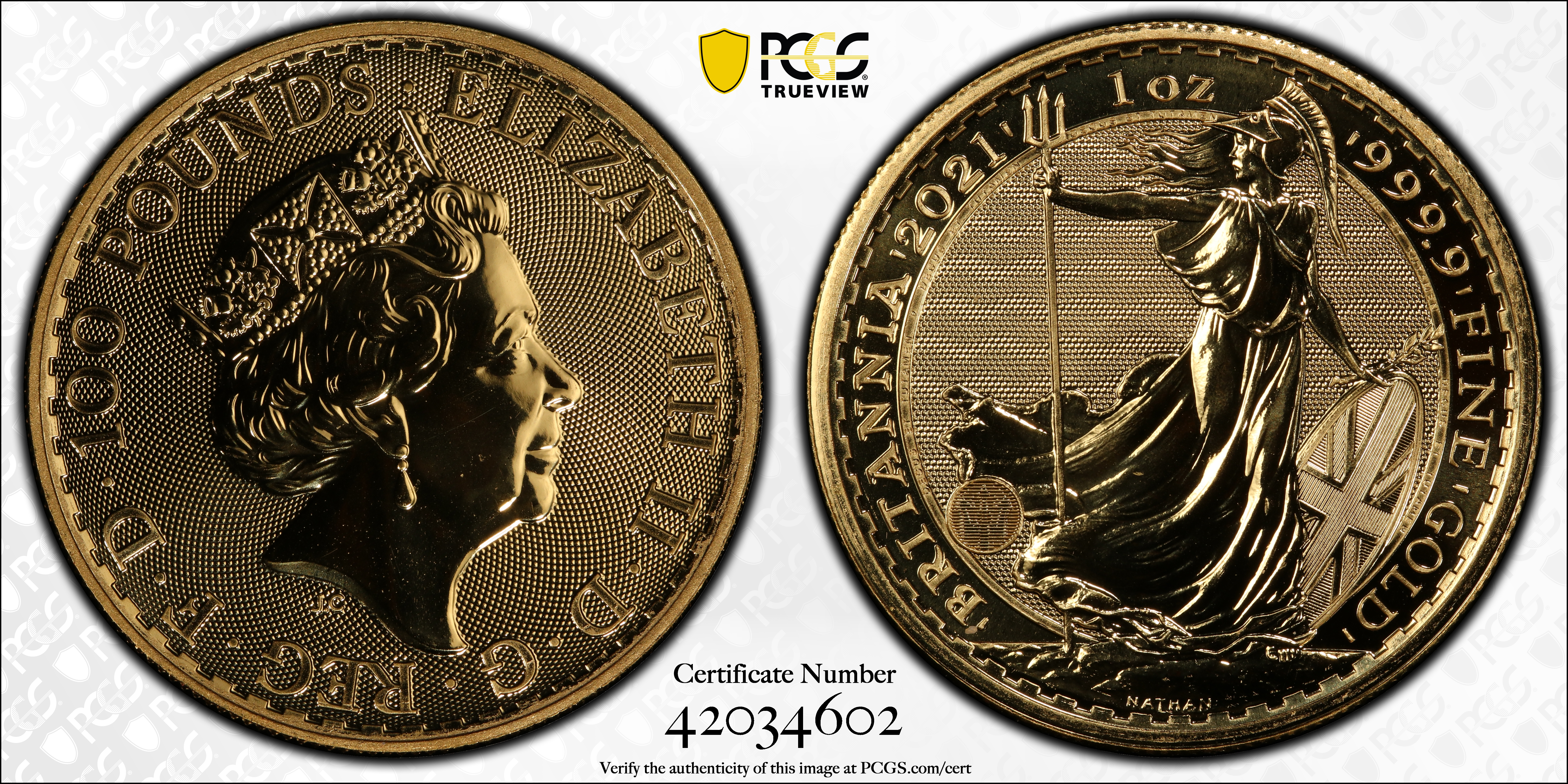 2021 £100 S-BQ20 Britannia Au MS67 Certification #42034602, PCGS #837001