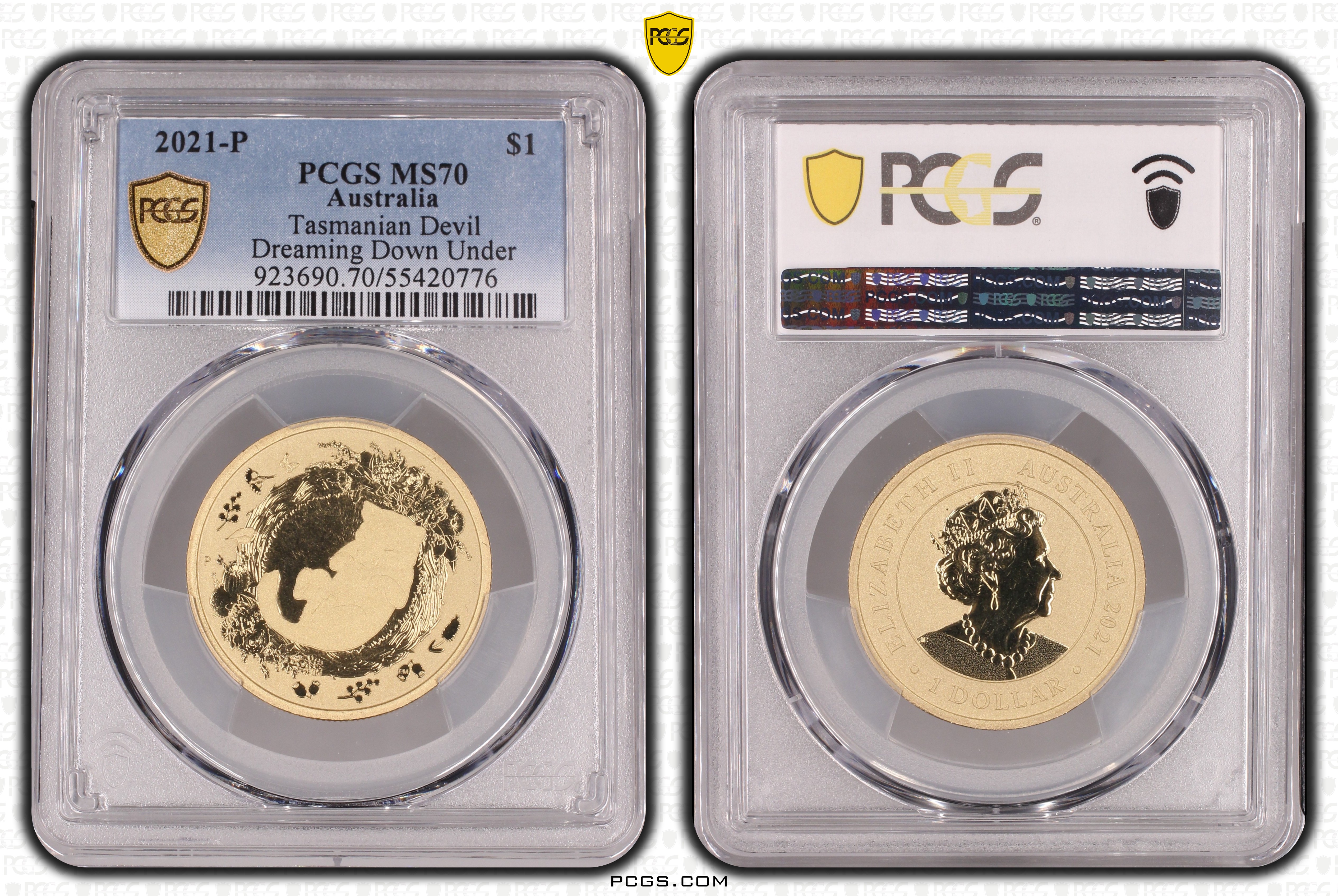 2021-P $1 Tasmanian Devil Dreaming Down Under MS70 Certification #55420776, PCGS #923690