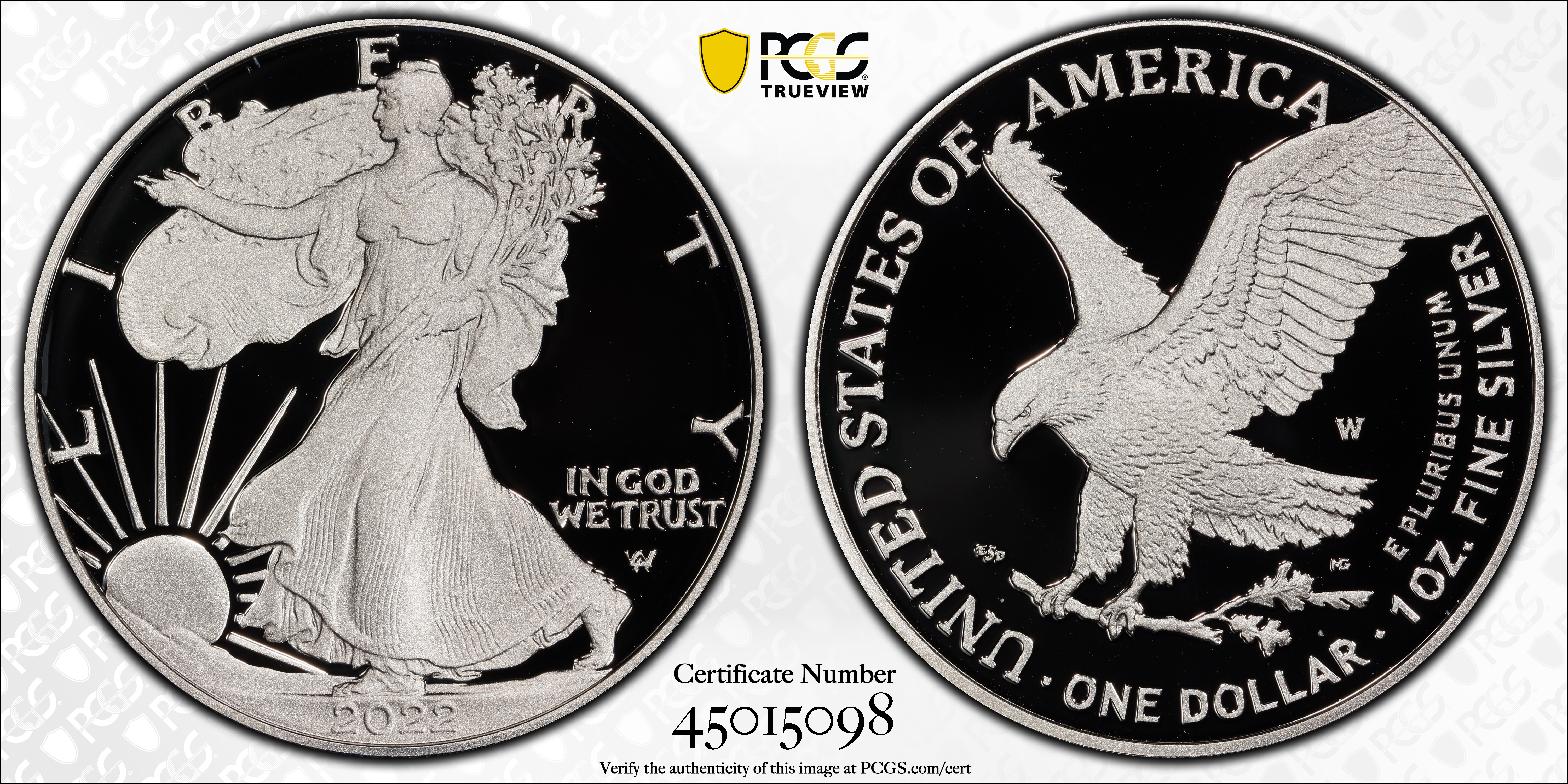 2022-W $1 Silver Eagle First Strike, DCAM PR70DCAM Certification #45015098, PCGS #902308