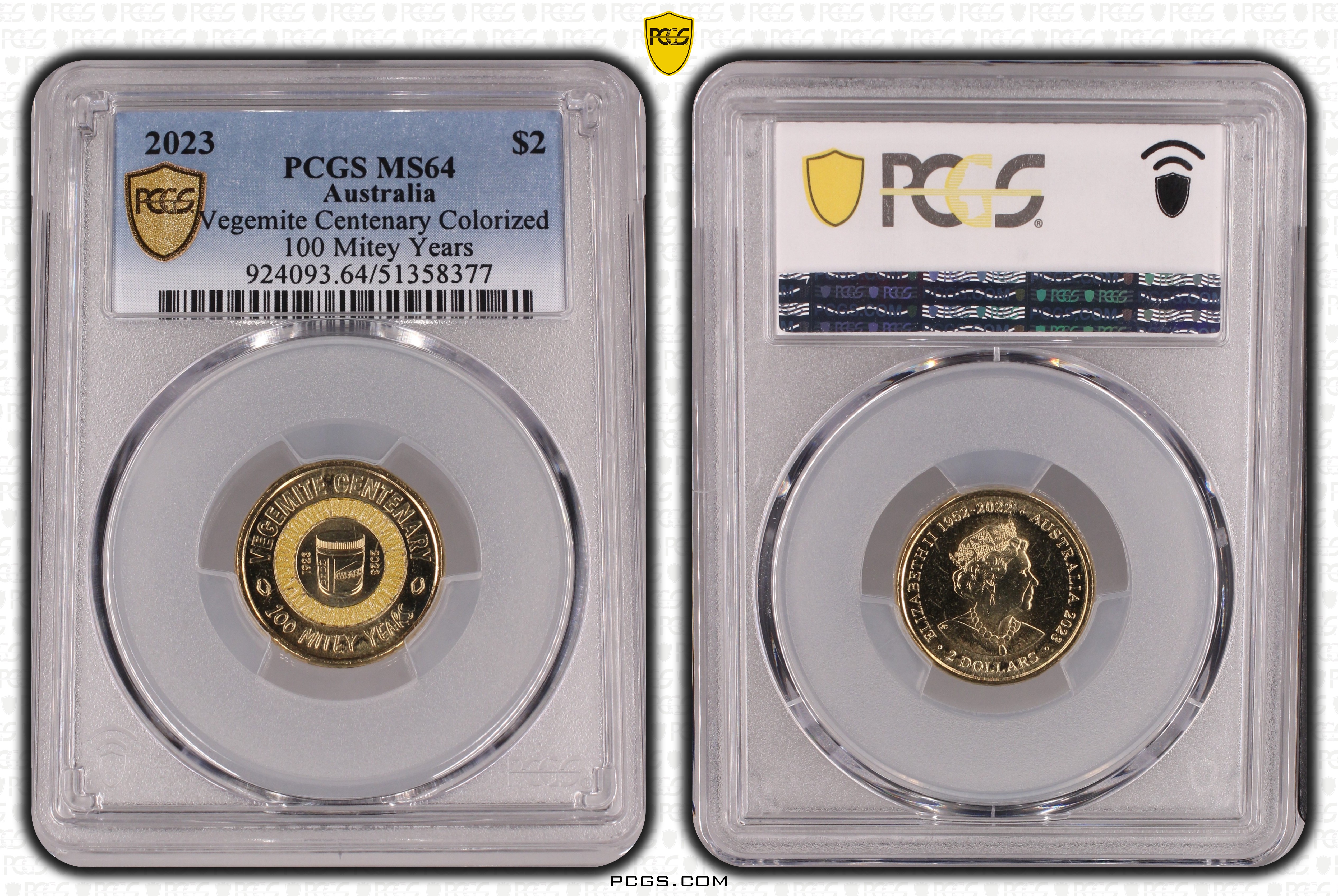 2023 $2 Vegemite Centenary Colorized 100 Mitey Years MS64 Certification #51358377, PCGS #924093