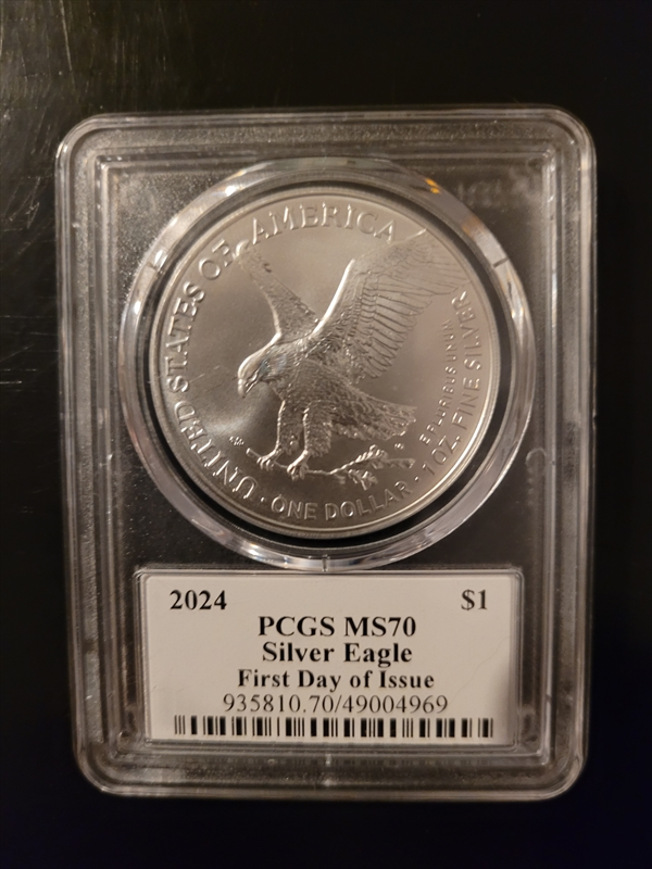 2024 $1 Silver Eagle First Day of Issue David Hall MS70 Certification #49004969, PCGS #935810