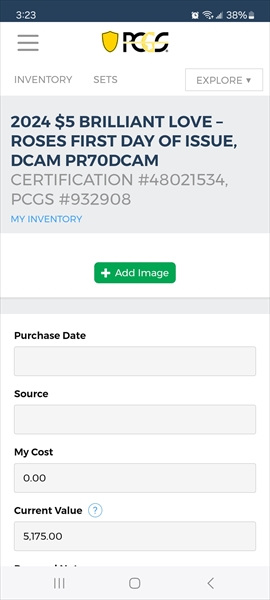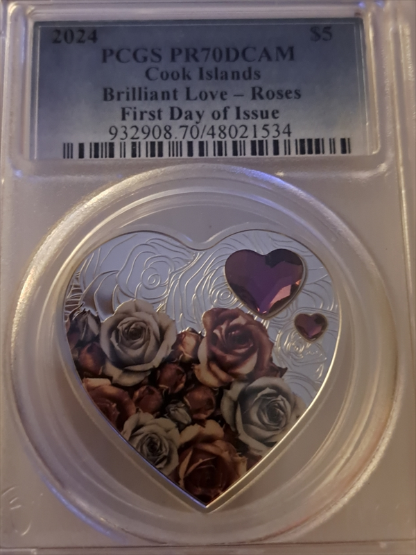 2024 $5 Brilliant Love – Roses First Day of Issue, DCAM PR70DCAM Certification #48021534, PCGS #932908