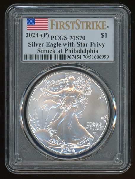 2024-(P) $1 Silver Eagle with Star Privy Struck at Philadelphia First Strike MS70 Certification #51606999, PCGS #967454