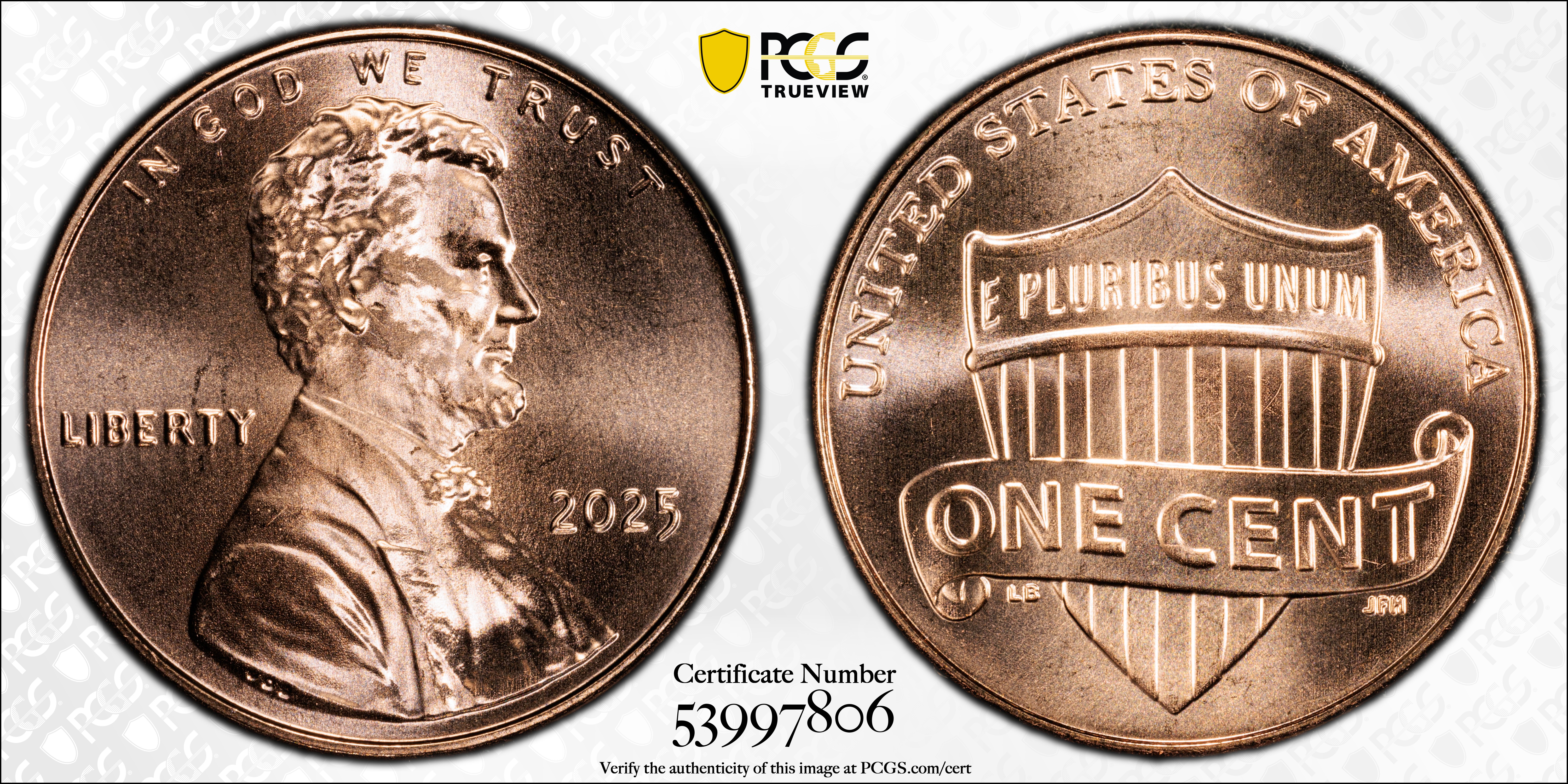 2025 1C Shield, RD MS67RD Certification #53997806, PCGS #977079
