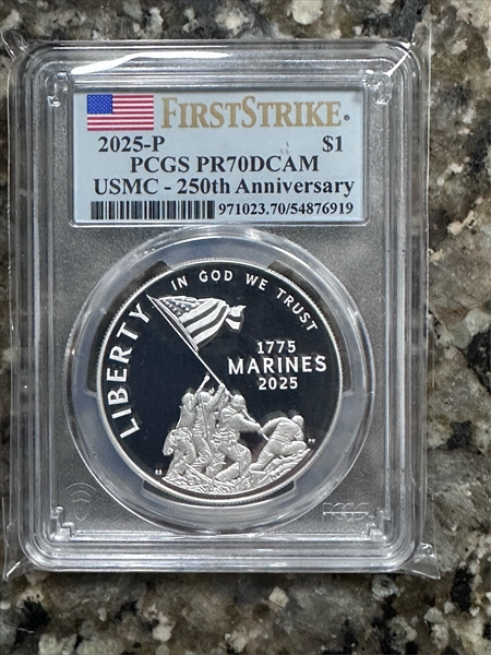 2025-P $1 USMC - 250th Anniversary First Strike, DCAM PR70DCAM Certification #54876919, PCGS #971023