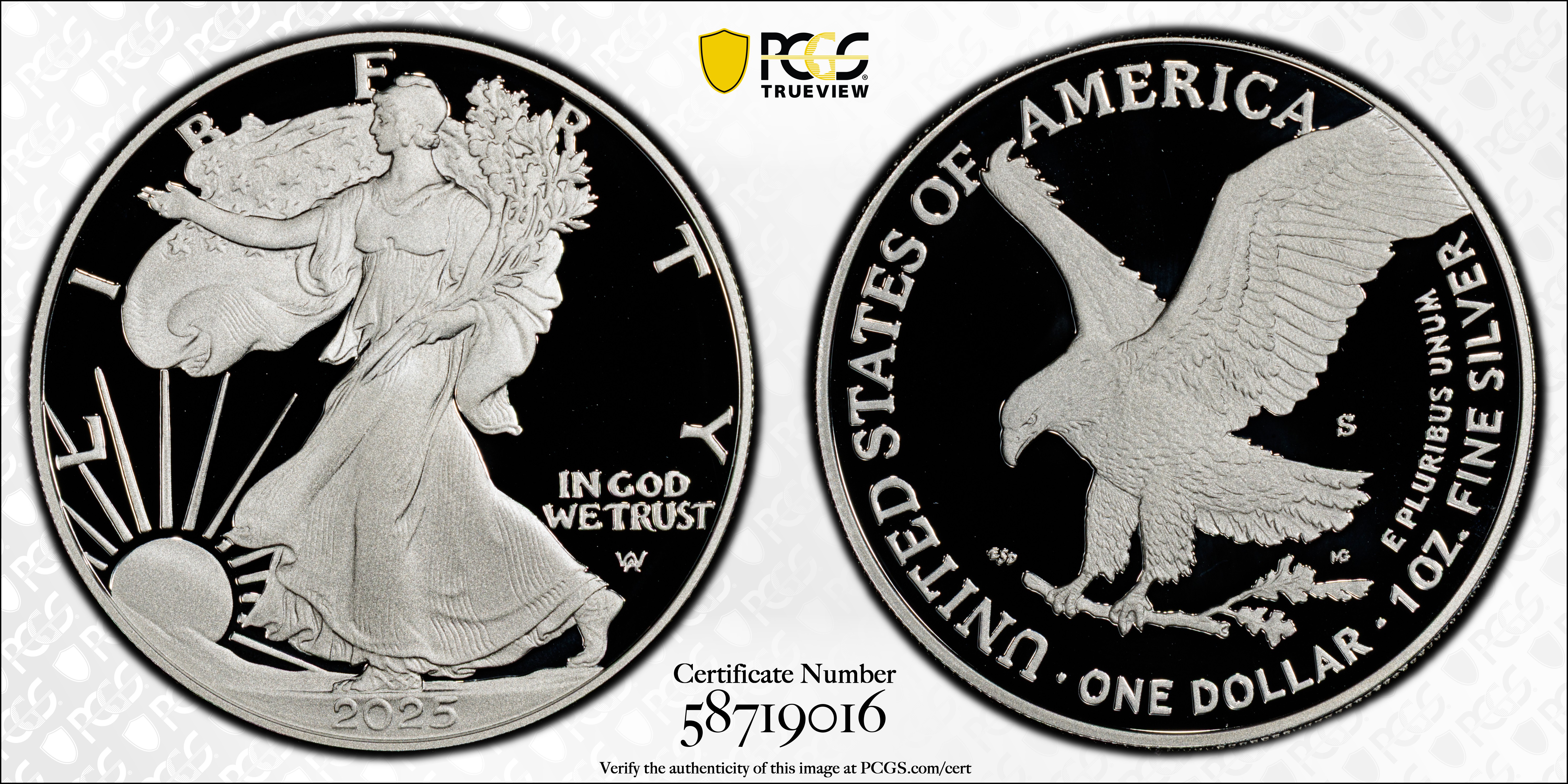 2025-S $1 Silver Eagle First Strike, DCAM PR70DCAM Certification #58719016, PCGS #999266