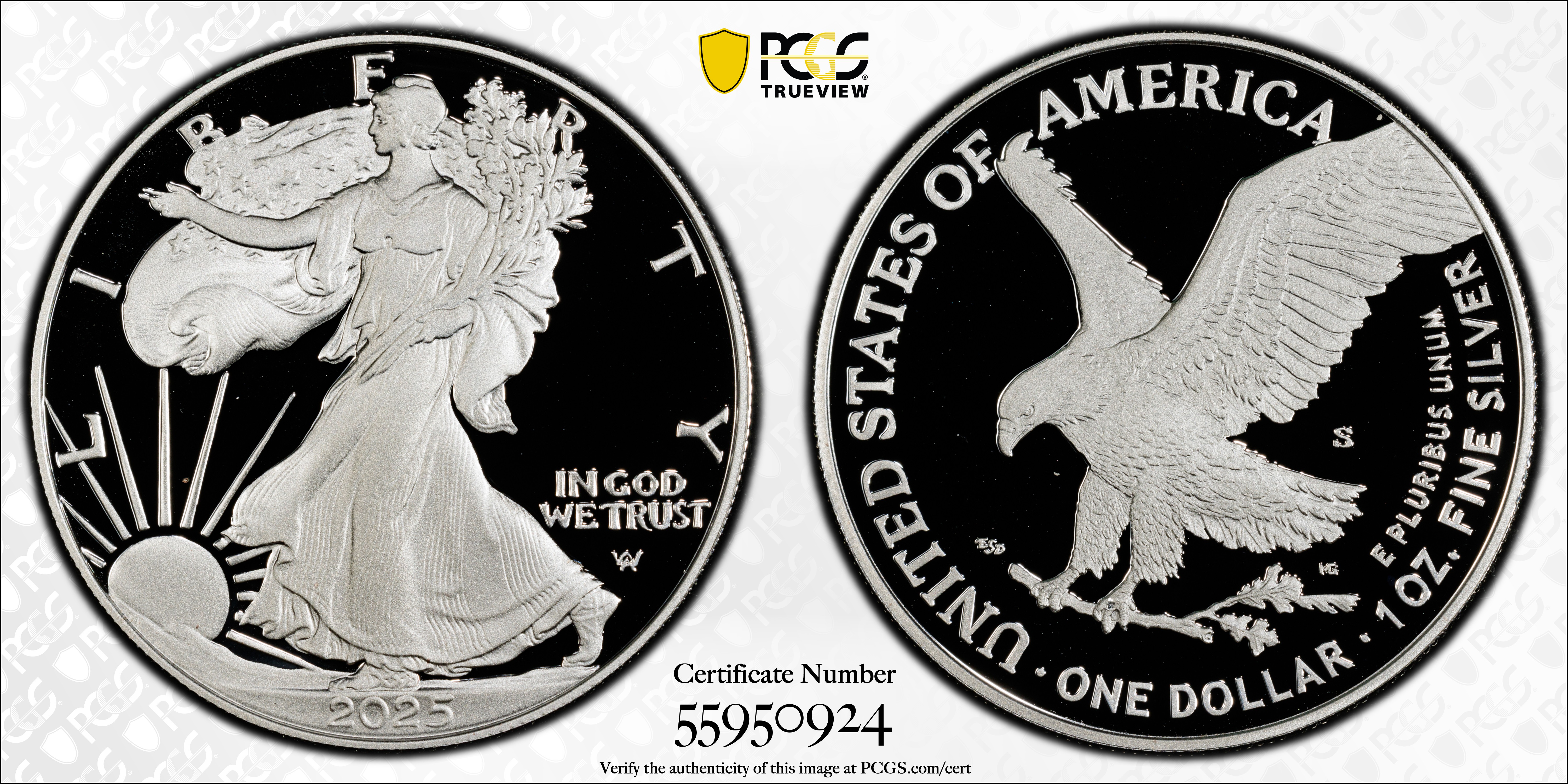 2025-S $1 Silver Eagle, DCAM PR70DCAM Certification #55950924, PCGS #999264