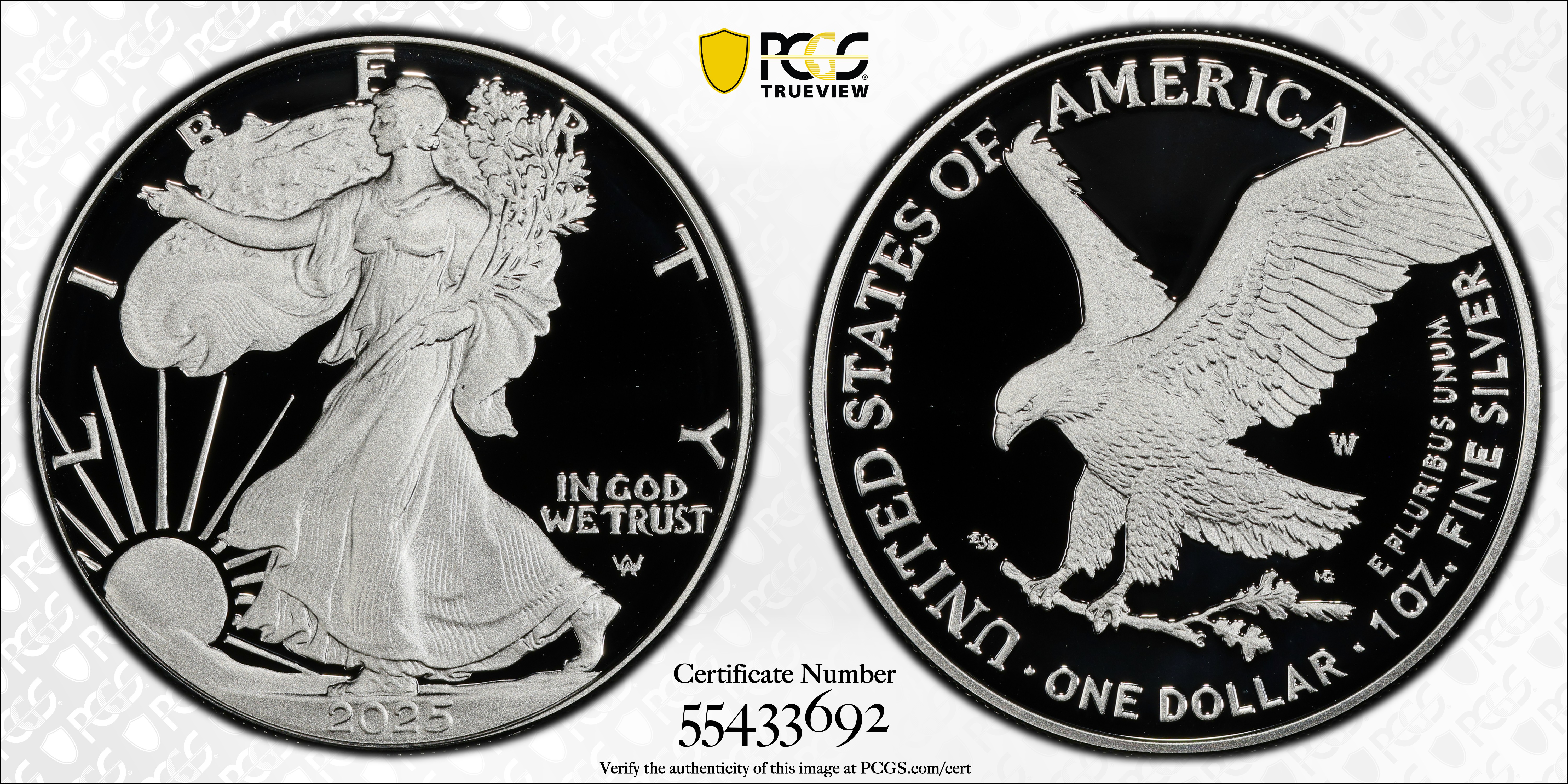 2025-W $1 Silver Eagle, DCAM PR70DCAM Certification #55433692, PCGS #971700
