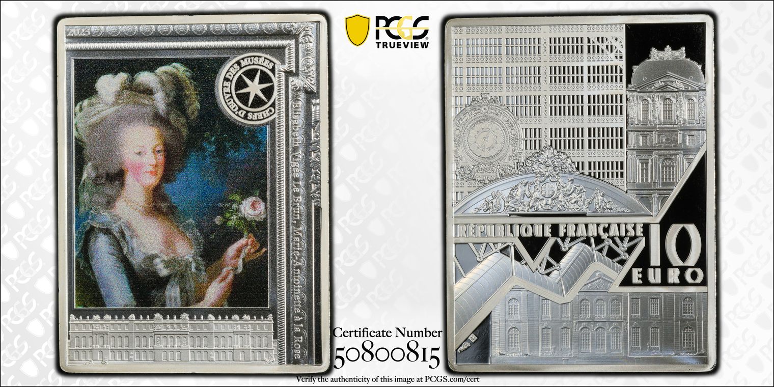 2010 France € 10 Mother Teresa PR69DCAM { PCGS-5 }. Commemorating the 100th Anniversary of her birth, this coin shows Mother Teresa comforting a child and on the reverse standing next to Pope John Paul II. Gold toning on the rim gives this silver gem a suiting halo. And Mother-T gets her picture on both sides of this coin with a mintage of 7,894.