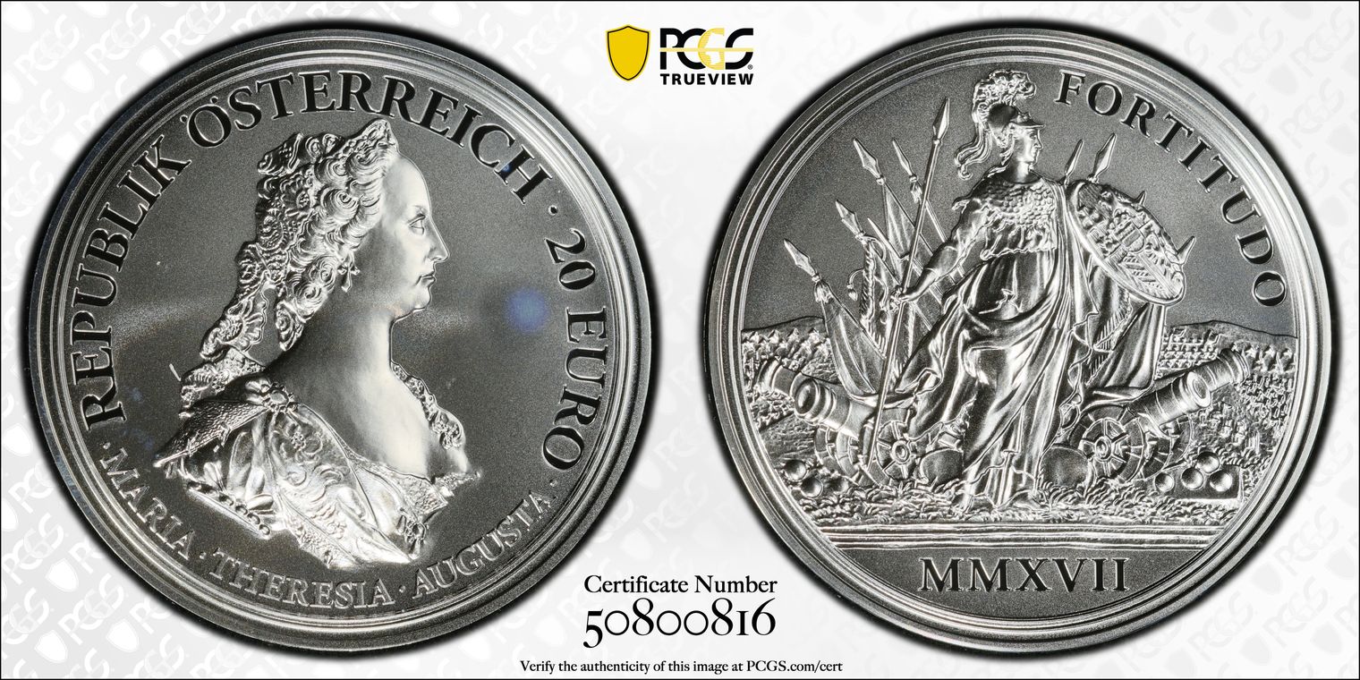 MMXVII Austria 20 Euro Maria Theresia PR70 { PCGS-5 }. This popular Austria-Hungarian monarch is elegantly (and perfectly) rendered on this non-circulating bullion silver gem in the spirit of the ever-popular Taler while paying tribute to "Courage and Determination"... that would be Fortitude and commemorating the 300th anniversary of her birth. Rendered in a matte-proof the coin exudes a unique elegant ethereal shimmer and features a somehow appropriate Roman Numeral date MMXVII (2017). It almost seems as if gun-metal bluing permeates the surface of the coins to establish a truly unique cartwheel patina with a beautiful high-relief antique silver look.