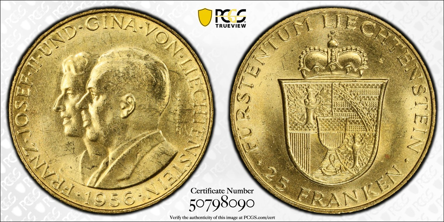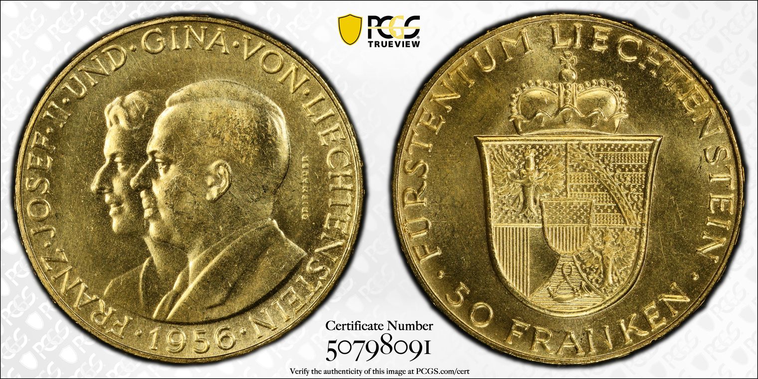 [RG-086]* 1956 Liechtenstein 50 Francs Franz Joseph II and Princess Gina MS65 { PCGS-5 }. Georgina, known by Gina, became popular for many social activities within Liechtenstein, including founding the Red Cross in her country, promoting women's suffrage and providing aide for refugees following WWII. Several denominations of this design were struck including the 100 Francs shown in Ron Guth's book. * Number 86 in Ron Guth's book "100 Greatest Women on Coins".