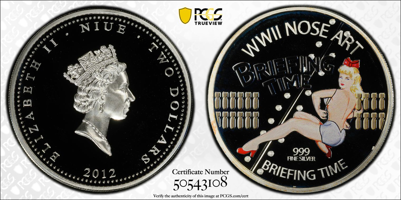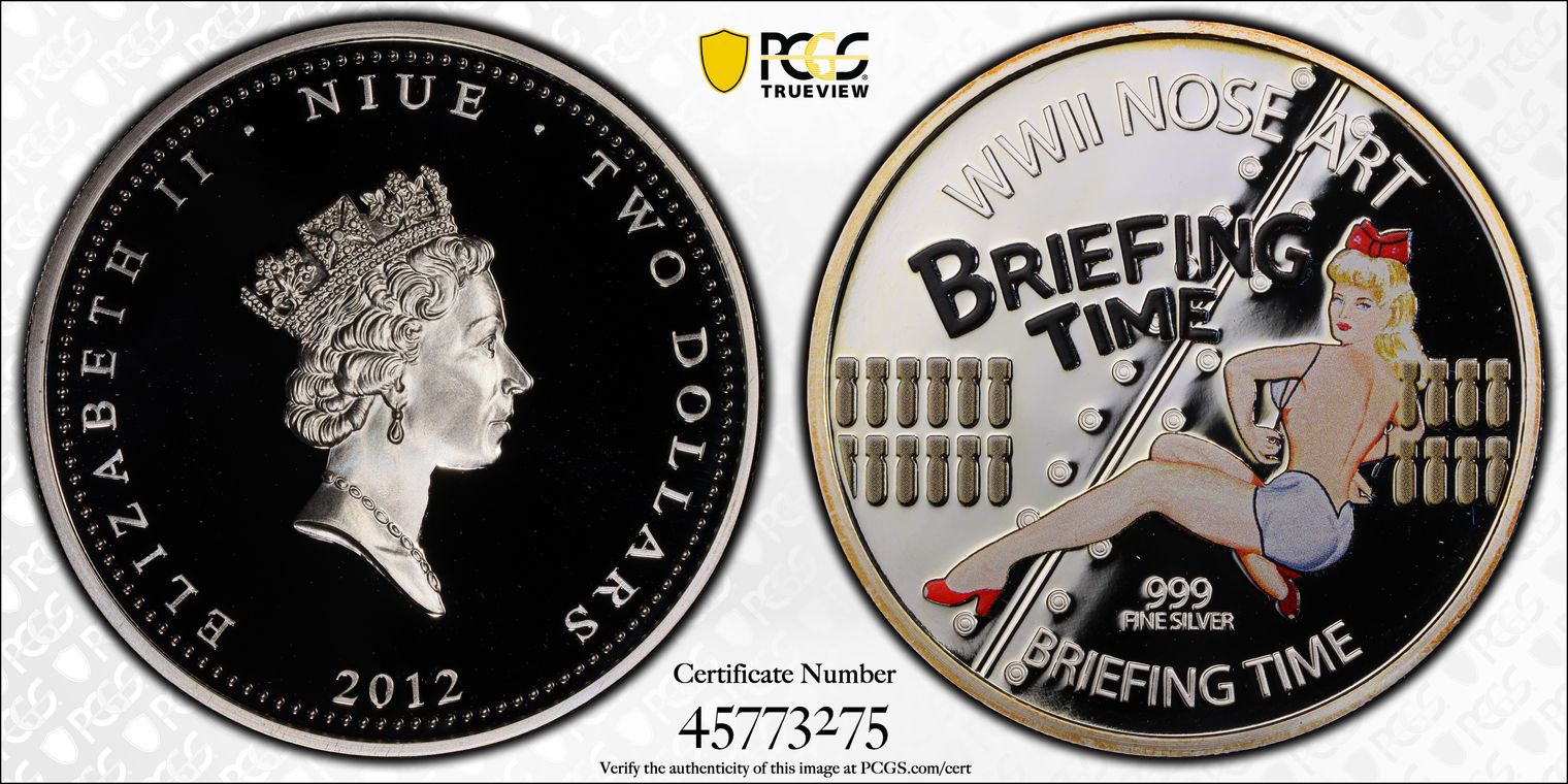 2012 Niue $2 WWII Nose Art Briefing Time PR70DCAM { PCGS-5 }. Interesting bomber pin-up art from WWII, and part of a 3-coin set paying tribute to the airmen that fought for freedom in the skies. This one-ounce perfect silver gem crossed from NGC. Briefing Time appeared on the nose of a B-25J assigned to the 57th Bomb Wing, 240th Bomb Group, 489th Squadron and served in the North African and Italian campaigns. Briefing Time shows the names of the crew flying its first 60 missions and is credited with sinking the Italian cruiser Taranto. Mintage of the series is 3,000.