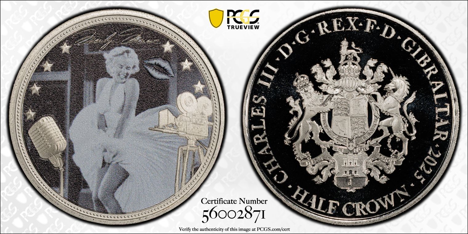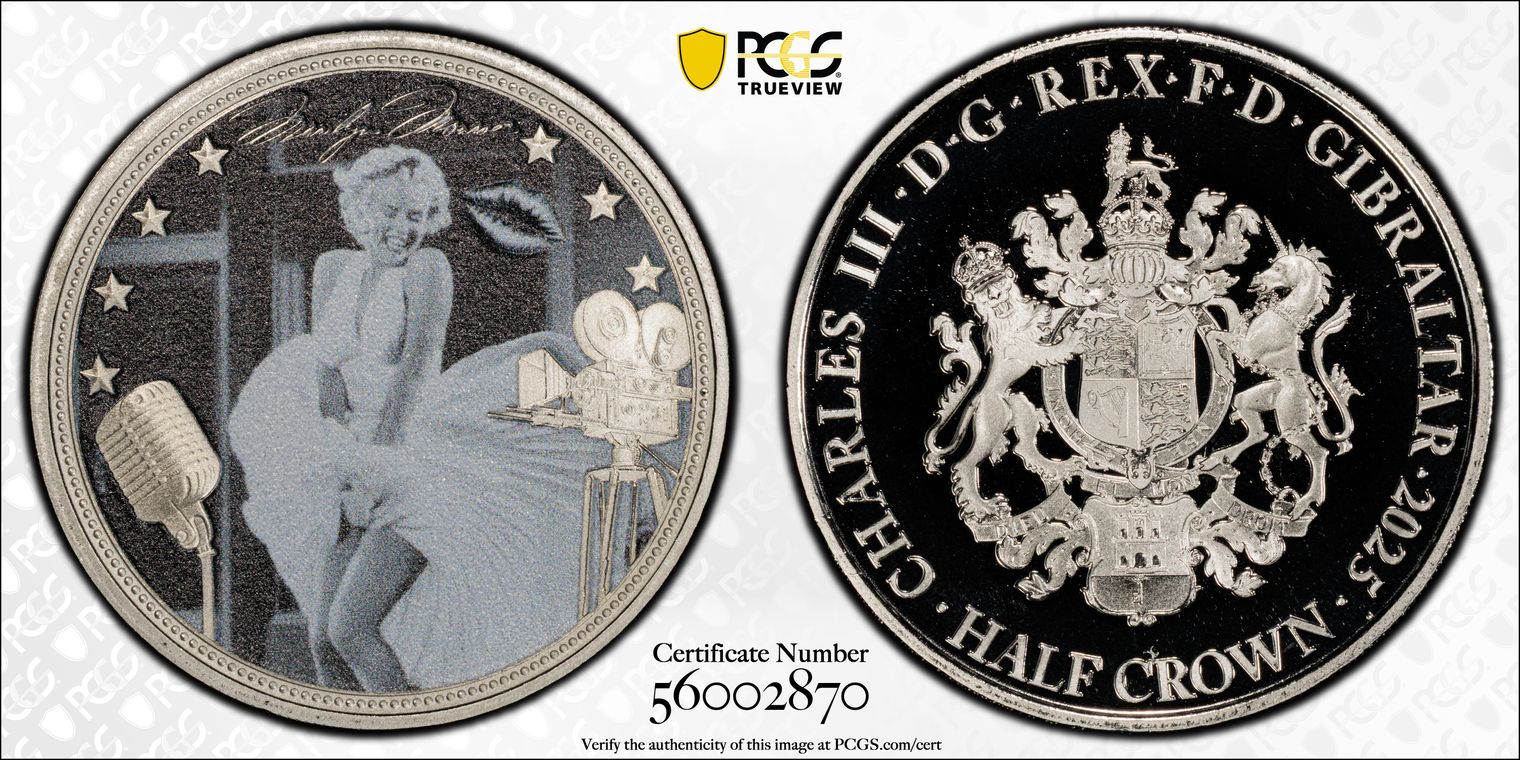 2025 Gibraltar 1/2-Crown Marilyn Monroe Behind the Diamonds PR70DCAM { PCGS-5 }. This flawless gem recreates that memorable scene from the Silver Screen presented as a grainy black-and-white cell projected onto this copper-nickel half-crown planchette. Iconic back-in-the day movie props frame this image with a microphone and movie camera. Her signature and lip-prints also appear with her. Who could have imagined that this blonde bombshell was living such a nightmarish life?