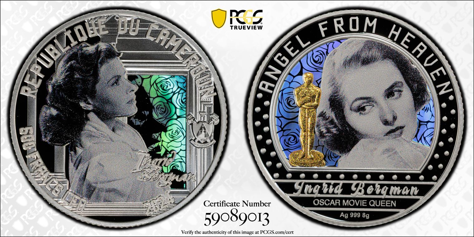 2024 Cameroon 500 Franc Ingrid Bergman Angel from Heaven PR70DCAM { PCGS-5 }. This silver flawless gem honors that Angel from Heaven of the silver screen and features Ingrid Bergman on both sides from award winning roles. One of her Oscars is shown in the foreground on the reverse side. The fields are accented with light-reflective material that offers varying colored pastel hues, as if stained-glass windows of roses form the backdrop in variegated beauty. Ingrid appears as if projected from original black-and-white cells from her movies giving us the grainy appearance from those early films. Ingrid won two best actress Oscars early in her career, and one best supporting actress towards the end for "Murder on the Orient Express" that honor her career spanning five decades, and whether it was her sultry eyes or her infectious accent she drew audiences into her stunning performances. My favorite performance was when she starred in "Casablanca" and it didn't even earn her a nomination, so you can appreciate the competition back in the day. Not like today in Hollywood, for sure. This recent issue affords collectors the chance to get a high-grade piece for this slot, but its modest mintage of just 300 assures that is a limited opportunity.