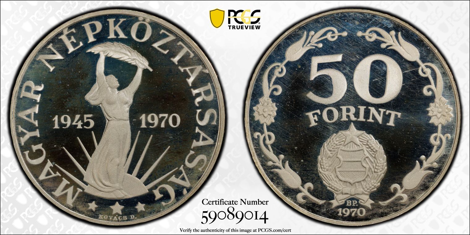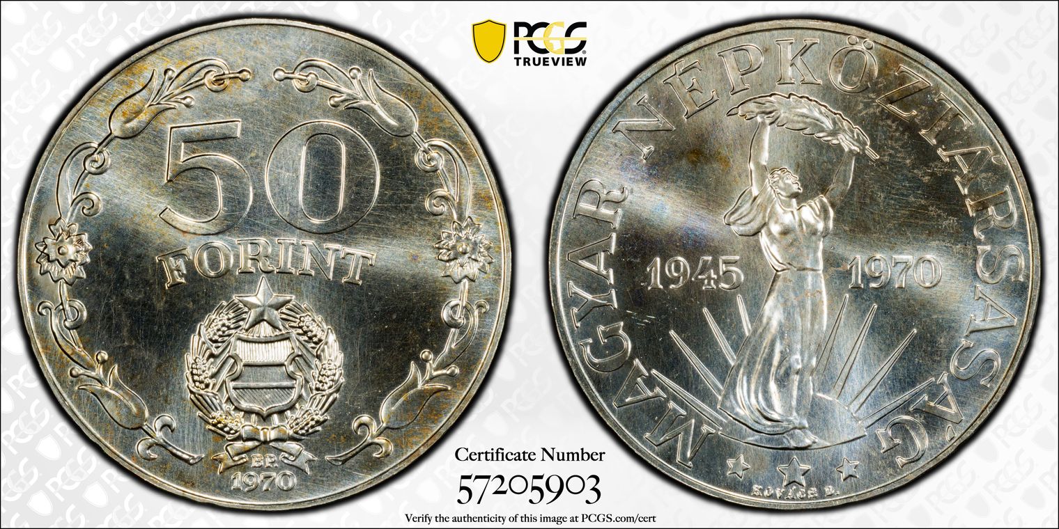 [RG-089]* 1970-BP Hungary 50 Forint Strobl Monument MS68 { PCGS-5 }. The Liberation Monument in Budapest was designed and built by Strobyl to commemorate the 25th anniversary for liberation from the Nazis. The original design was for a woman holding a baby; but Soviet 'suggestion' was to swap the baby out for the frond. This 64% silver gem has heavy rainbow toning on both sides. This commemorative mintage was 20,000 for circulation strikes. Minted in Budapest (BP). This capital city combined its name from two smaller towns on either side of the Danube, Buda and Pest. In this same spirit, this statue provides a unifying message that seems to be lost in our divisive world. * Number 89 in Ron Guth's book "100 Greatest Women in Coins".