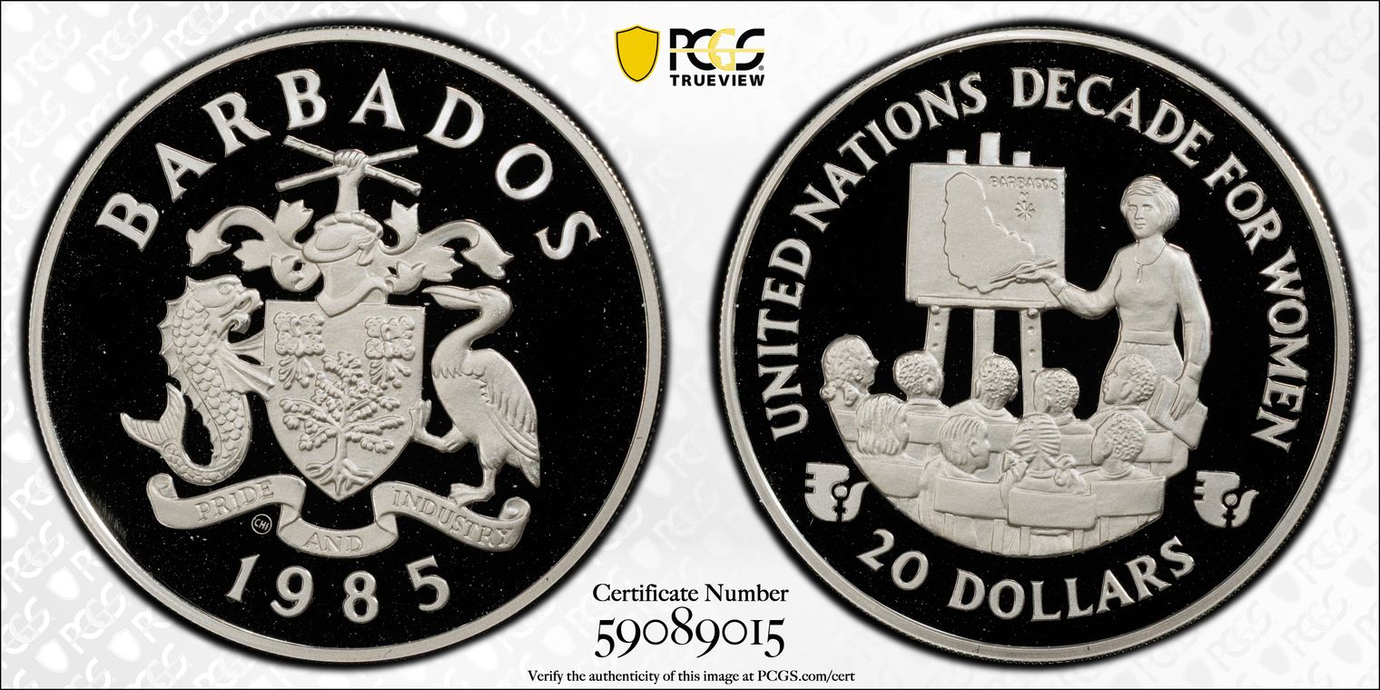 1985 Barbados $20 Decade for Women PR68DCAM { PCGS-5 }. This UN initiated series commemorates women around the globe and their contribution to society, in particular in furthering the rights, skills and acceptance of women. Here a female teacher is instructing a class of younger women, and the point of this coin is the importance of Education.