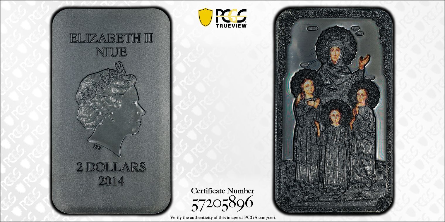 2014 Macedonia 100 Denar Faith, Hope, Charity and Mother Sophia PR70DCAM { PCGS-5 }. Faith, Hope and Love (Charity) are saint martyrs from the 2nd century AD in Rome. They are also Christian virtues mentioned in the New Testament. Orthodox religions depict these in icons as young girls along with their mother on the obverse; Roman Catholicism shows them as adult women on the reverse. Only 5,000 rectangular coins were struck.