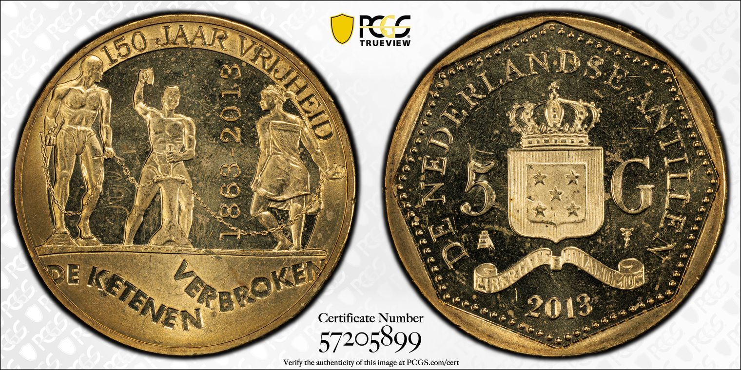 2013 Antilles 5 Gulden Abolition of Slavery PR70DCAM { PCGS-5 }. To pay tribute to the Sesquicentennial of the Abolition of Slavery, this flawless silver gem depicts the breaking of shackles binding a male and female slave. In this year Willem-Alexander ascended to become King of the Netherlands when his mother Queen Beatrix (Number 60 on Ron Guth’s list) abdicated. Just 750 silver commemorative proofs were minted. The design captures the Tula Monument in Willemstad Curacao.