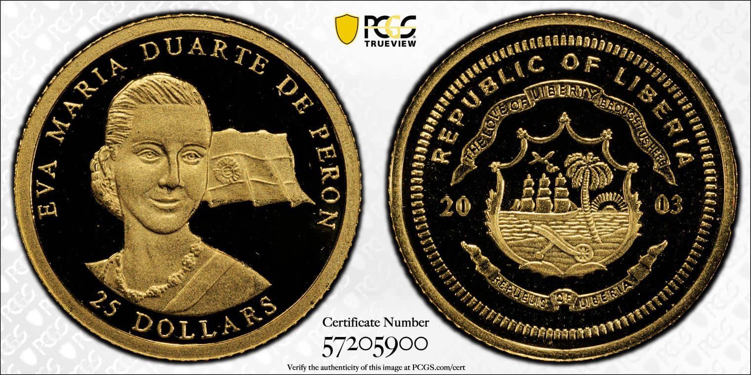 2003 Liberia $25 Eva Duarte Peron PR70DCAM { PCGS-5 }. This diminutive flawless gold beauty is from a series of historical persons offered this year by this African nation. Eva rose from poverty to become a beautiful and beloved entertainer in Argentina, catching they eye of an army officer, thrusting her into the national political spotlight when her husband took control of government. Her story is loosely told by the musical Evita, and the song "Don't Cry for me Argentina" is her untimely farewell to her nation as she succumbed at 33 to breast cancer. Evita appears in front of the flag of Argentina, young and beautiful and an image synonymous with her country. On the 50th anniversary of her death, Evita was recognized on the 1 (silver), 2 (copper-nickel) and 5 peso (gold) coins of Argentina. Five years earlier she also appeared on 50 centavo and 1 peso coins for general circulation.