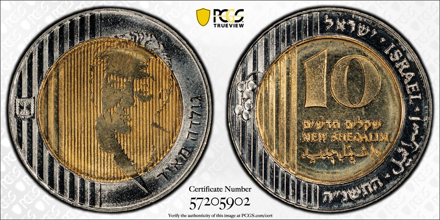 [RG-065]* (1995) Israel 10 Sheqalim Golda Meir MS68 { PCGS-5 }. This bi-metalic steel coin has a nickel-plated ring surrounding a bronze plated center disc. This unique gem In Memory of Golda Meir is rendered in an artistic raster illusion. This one year issue does not display the date of mintage on any of the 1,584,000 pieces struck for general circulation. It is fairly easy to find a circulated specimen although higher grade samples prove a tougher find. * Number 65 in Ron Guth's book "100 Greatest Women on Coins".