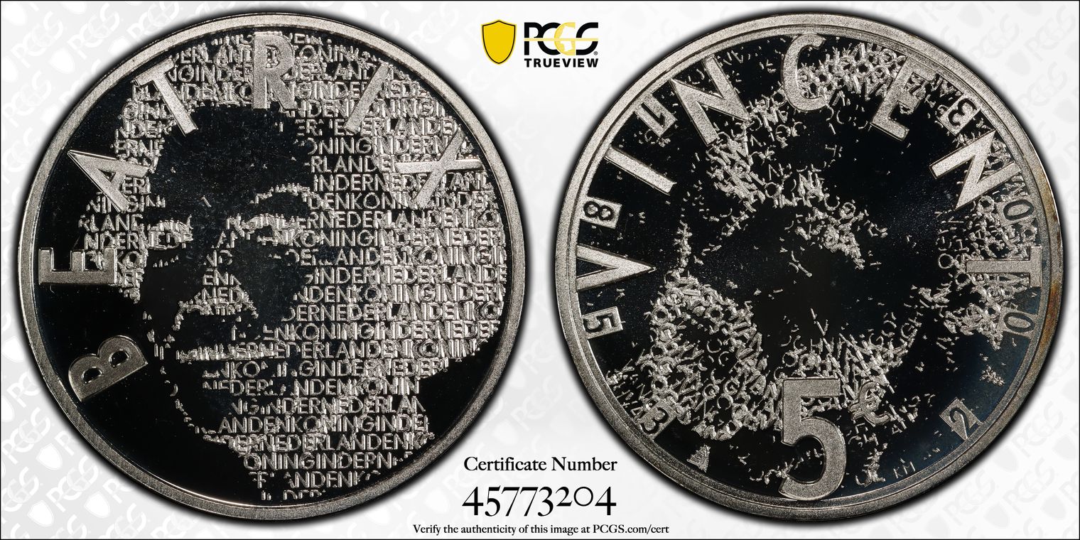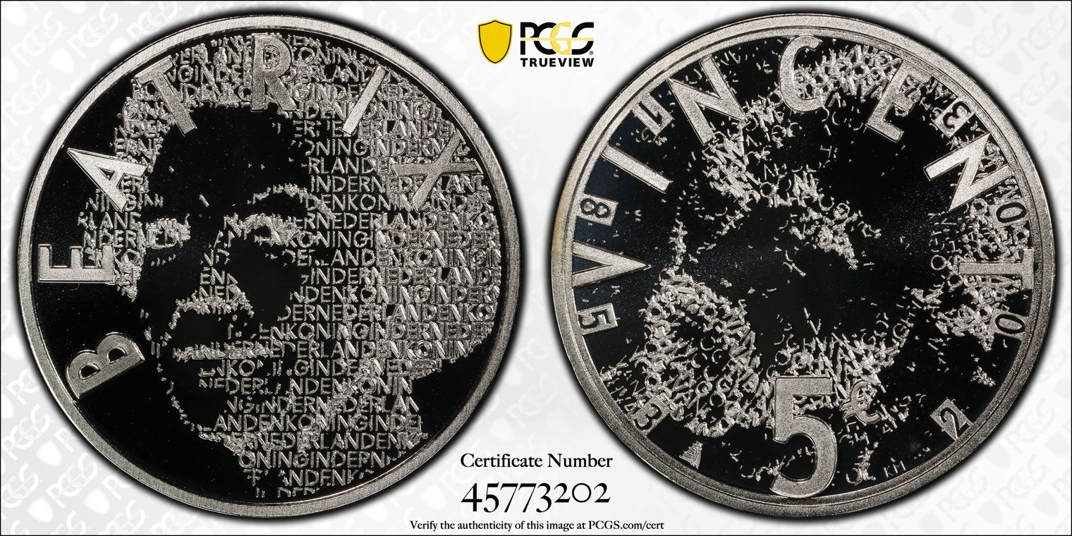 [RG-060]* 2003 Netherlands 5 Euro Vincent van Gogh PR70DCAM { PCGS-5 }. This silver gem features an impressionistic rendering of Queen Beatrix on one side and a Vincent van Gogh self-portrait on the flip side. Their portraits are rendered with repetitious text to form a pixelated image against impressive perfectly black mirrors to create striking works of art. "KONIGEN DER NEDERLAND" is used to create the Queen's image; fittingly it translates Queen of the Netherlands. "VINCENT VAN GOGH" is used to create the artist's image. There were 100,000 proof-like strikes. This perfectly rendered piece is one of my favorites; but, then, I've always been partial of impressionist art. It's one of those things that causes one to do a double-take and agree, "Man, that's cool!" * Number 60 in Ron Guth’s book “100 Greatest Women on Coins.”