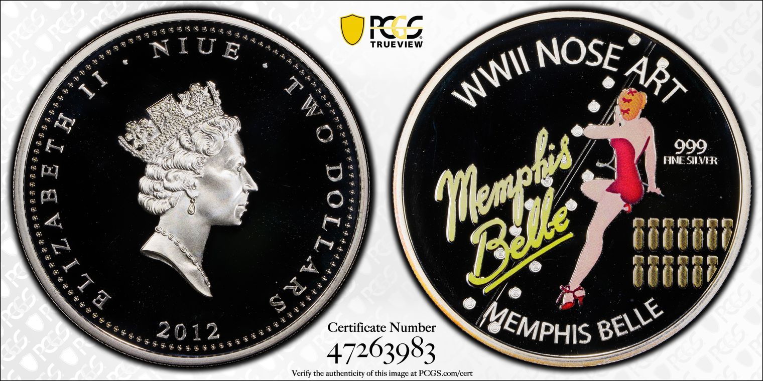 2012 Niue $2 WWII Memphis Belle PR69DCAM { PCGS-5 }. From the WWII Nose Art series of three coins, "Memphis Belle" was immortalized by the 1990 movie of the same name, detailing a B-17 and its crew as it flew its 25th combat mission. This one-ounce silver gem has it pin-up artfully rendered in vivid colors to make it really pop. The aircraft was the namesake of pilot Robert K. Morgan's sweetheart Margaret Polk and resident of Memphis. Robert requested a pin-up from Esquire Magazine to go with the name, and the group artist faithfully reproduced the nose-art on both sides of the B-17. Mintage of this series is 3,000.