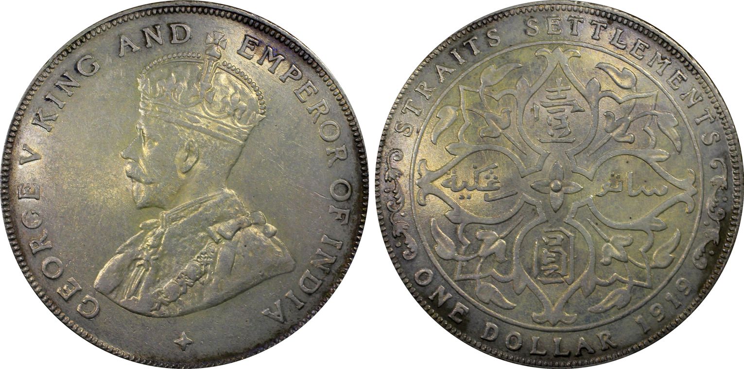 Straits Settlements, Dollar Dated 1919. KM-33. George V. PCGS graded AU58. Much Nicer than Assigned Grade. Ex Goldberg Auction #74, June 2013, Lot 5040.