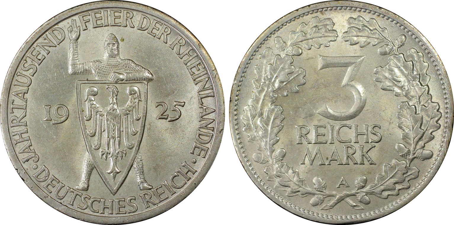 Germany, Weimar Republic 3 Mark 1925-A "1000 Years of the Rhineland", PCGS MS64. Light toning. Gorgeous Specimen.