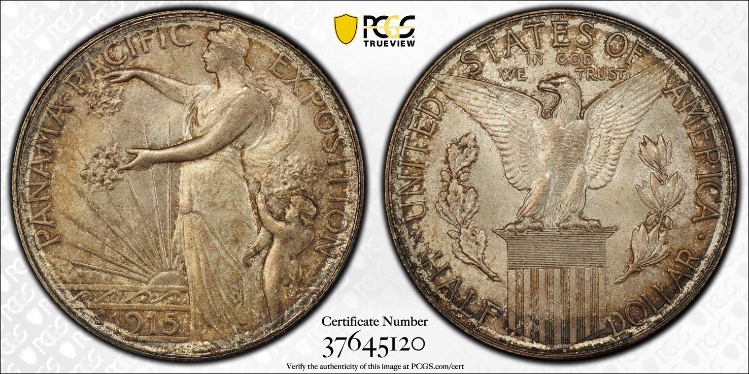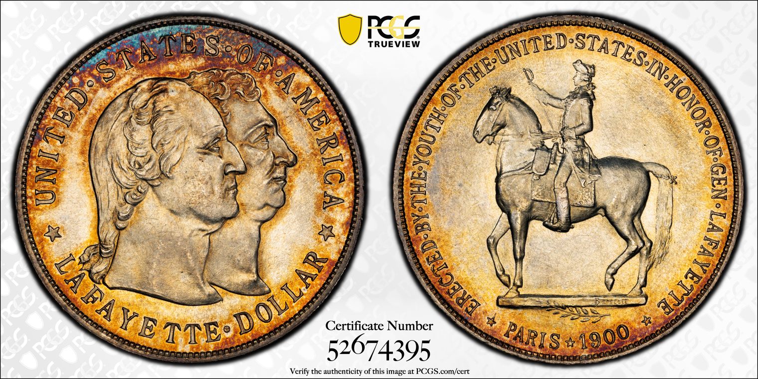 An eye-catching gem from an original mintage of 36,026. The first and only one-dollar denomination commemorative issued and extremely popular as such! Sharply struck surfaces glow with luster highlighted by vibrant mottled tones in shades of russet, blue, and golden-orange. Attractive and certainly high-end, a piece that requires viewing in hand to fully appreciate, but will not disappoint!