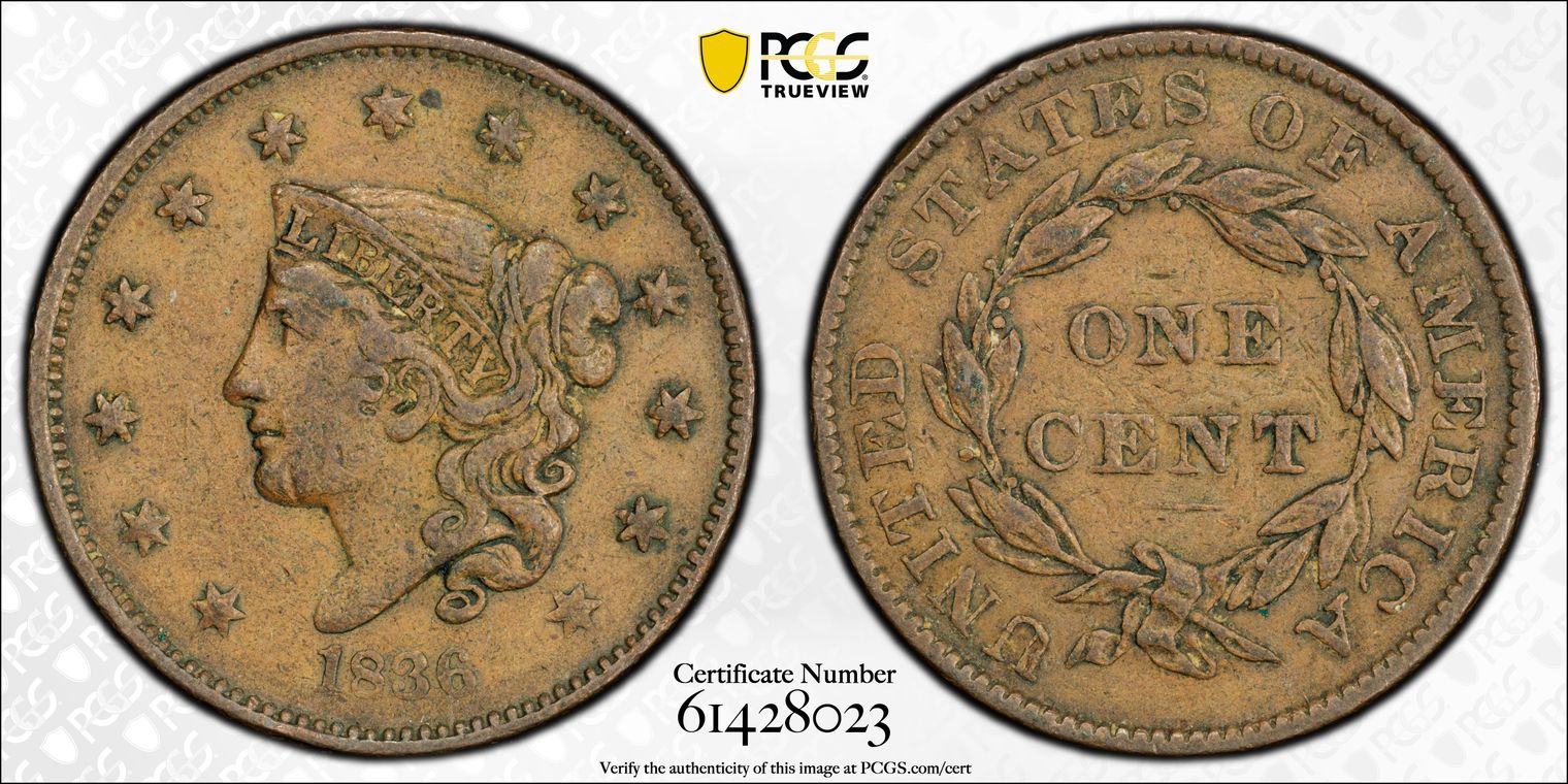 1795 FLOWING HAIR, LIBERTY CAPPED, DENTICLED BORDER LARGE CENT - PLAIN EDGE ; S-78 Plain Edge; Purchased raw and then graded PCGS Genuine - Fine Details (97 - Environmental Damage) - N97BN; PCGS# 35729, a Variety of PCGS# 1380; Gold Shield. Rarity 1; mintage 501,500; Top of the 5 barely touches the bust. This is diagnostic of this type; Numerous hairline cleaning scratches; finely porous; some corrosion on reverse. From the Dr. John H. Brown Collection.