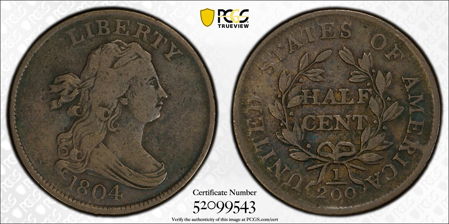 1804. DRAPED BUS HALF CENT - Crosslet 4, Stems ; C-10 ; Purchased raw as one of four 1804 Half Cents ; Graded PCGS F15.