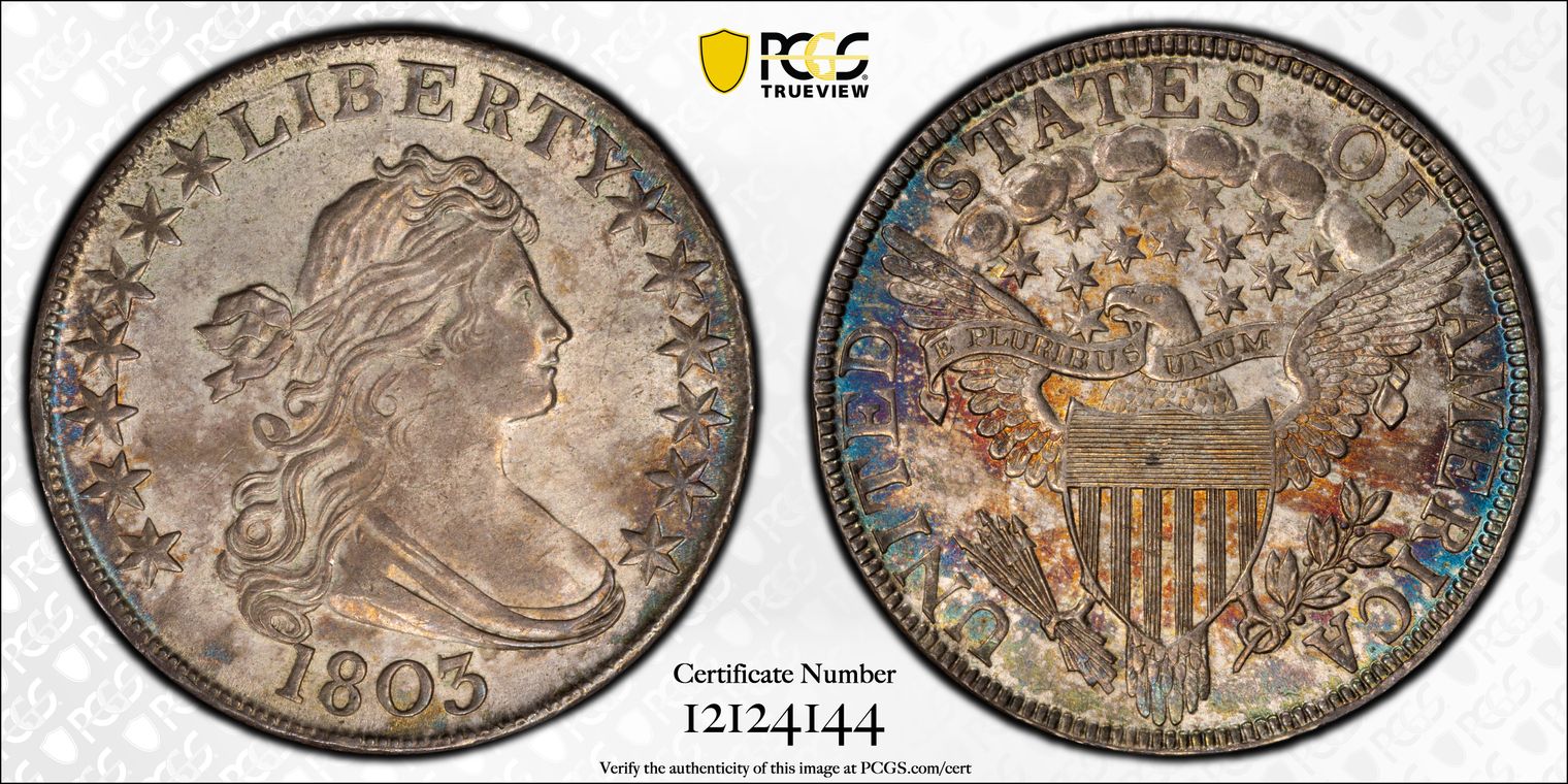 O-103. R.3. CAC. Tied for second finest known. Per cataloger, "Bold eye appeal. Condition census rarity. Draped Bust half dollars are highly sought-after in Mint State, but the vast majority of pieces in this grade range are from the 1806 or 1807 issues, and it is unusual to encounter an 1803 half in Uncirculated condition. Mintage figures contribute to this on a marginal level; the 1806 and 1807 boast the highest production totals of the type at nearly 840,000 and more than 300,000 pieces, respectively, while the 1803 was struck to the extent of just 188,234 coins. Moreover, most surviving 1803 halves are well-circulated, grading XF or lower; AU representatives are scarce only a handful of Mint State pieces are known. The 803 is divided into two chief varieties, differentiated by the size of the 3 in the date. The Large 3 variant is composed of three different die pairings (O-101, -102, and -103), all sharing the common obverse. The Small 3 variety is represented by just a single die marriage (O-104), and is thus somewhat scarcer by comparison. Of the three Large 3 varieties, O-103 is perhaps the most interesting. This variety matches the Large 3 obverse with the Large Stars reverse that is later employed for O-104, and is thus readily attributed. On this marriage, the obverse is clashed and lightly cracked through the top of LIBERTY, not surprising given this is the third and final use of this head die. The present Select example is one of only six Mint State Large 3 examples at PCGS, including two MS62, three MS63, and a single MS64 finer; two Small 3 examples are recorded in MS62 and MS64, respectively. All varieties included, NGC shows only eight Mint State 1803 halves, the finest of which is a sole MS63 coin, also representing the O-103 variety (5/15). This ranks the currently offered coin well-within the upper range of the Condition Census, both for this variety and for the entire issue. The frosty surfaces show modest lavender-gray and champagne hues overall, with deeper pewter-gray overtones on the high points and a few vivid ocean-blue crescents on either side of the reverse; small amber accents further explore the interior fields. The coin is a trifle weak on some of the left-hand stars, but is otherwise well-struck and devoid of adjustment marks. This CAC-endorsed condition rarity will be a landmark acquisition for a lucky Draped Bust half collector."