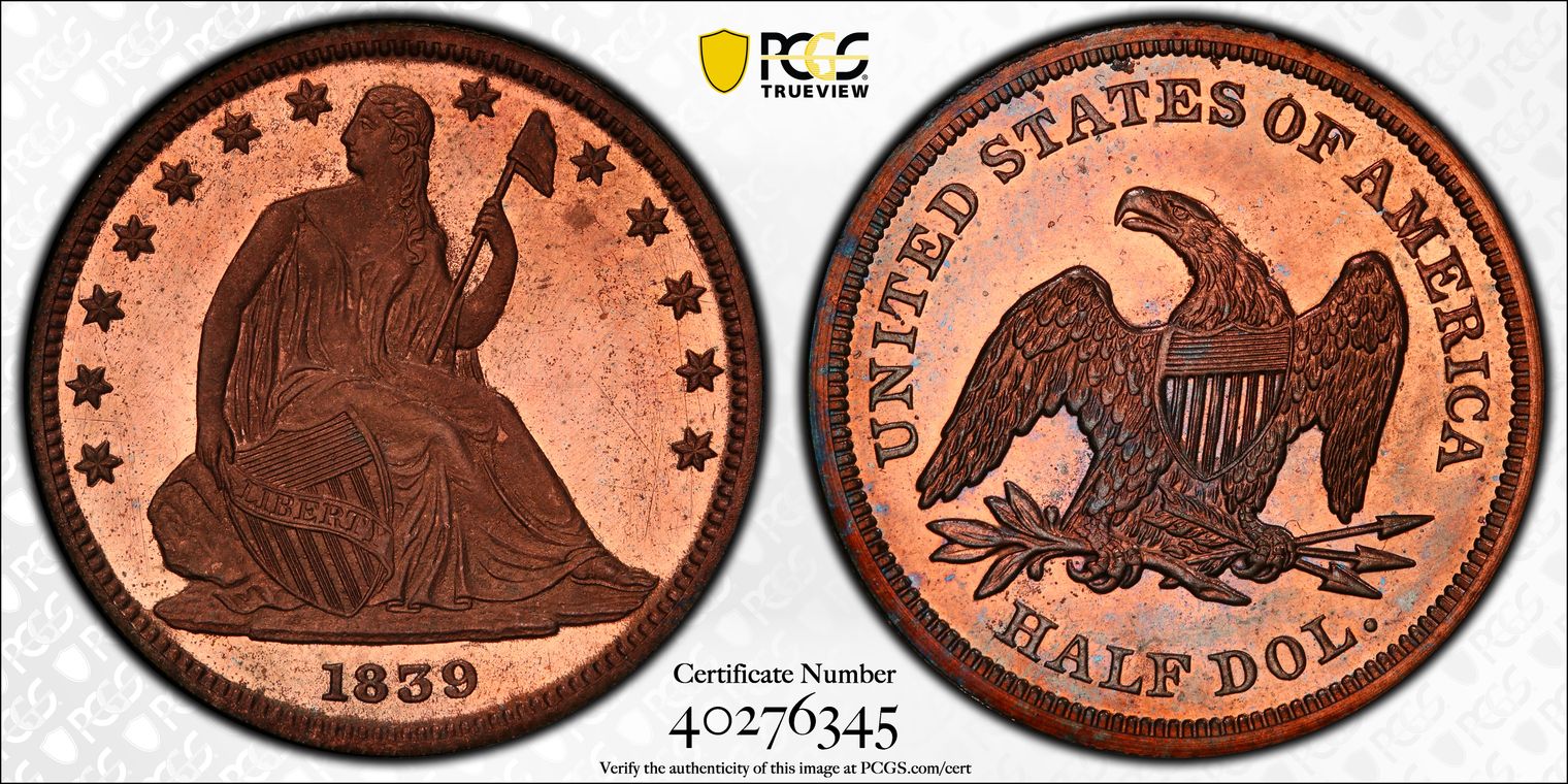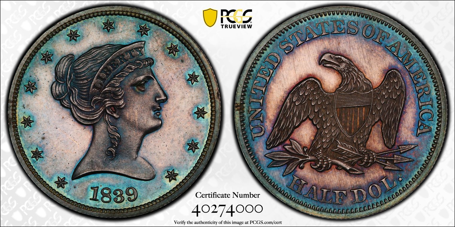 Judd-97. R7+. Simpson. Four Known (one in Smithsonian). Silver. Restrike. Per cataloger, "The Backward Liberty. Judd-97 Restrike, Pollock-107, High R.7, PR65 PCGS. CAC. Ex: Simpson. The obverse depicts a figure of Liberty facing right on the obverse, mouth open, hair tied in a bun, one curl draping down the neck behind the ear, sporting a coronet reading LIBERTY, rounded forward bust and pointed rear bust, 13 stars around, date 1839 below. The reverse offers the regular Large Letters die seen on some regular-issue 1839-dated half dollars. Struck in silver with a reeded edge. The design is called "Coronet Head facing right" in Judd, but it is sometimes known as the "Backward Liberty." It is strongly reminiscent of the ten dollar Coronet Head gold coins of 1838 and 1839 in the dangling curls and sharply pointed rear bust, but it nonetheless just looks decidedly odd. Because the profile of Liberty faces right rather than left, the LIBERTY on the coronet begins with the L behind the ear and the last letter Y is above the forehead. Judd comments that "neither this die nor any like it were ever used for coinage". This example shows die rust most perceptible on the profile of Liberty, although less so than on many of these 1860s- or 1870s-era restrikes. Lovely pale-blue and plum-rose patina prevails on well-mirrored surfaces, an extremely attractive coin. Perhaps four or five exist including the Smithsonian example, with this piece certainly among the finest. Population: 1 in 65, 0 finer (10/20). Ex: Anderson DuPont (Stack's, 11/1954), lot 2416; River Oaks (Bowers and Ruddy, 11/1976), lot 964; Stewart Witham-Auction '81 (RARCOA, 7/1981), lot 327; Morris Evans Collection (Bowers and Merena, 8/1998), lot 2037; Superior (5/2003)." Heritage Auction of Bob R. Simpson Part 2 on November 19, 2020, Lot 3100.